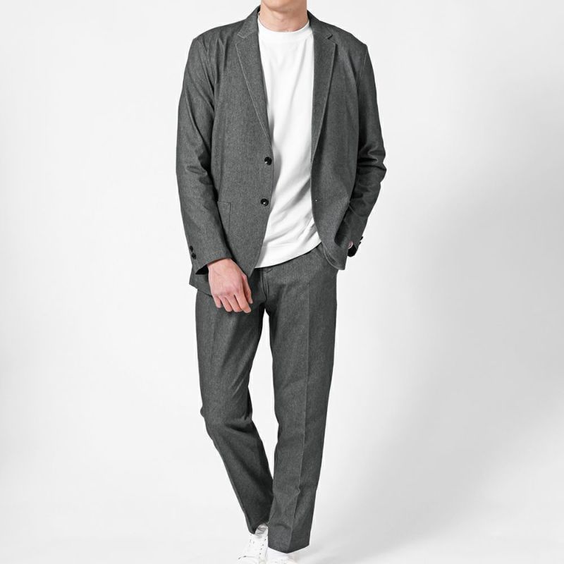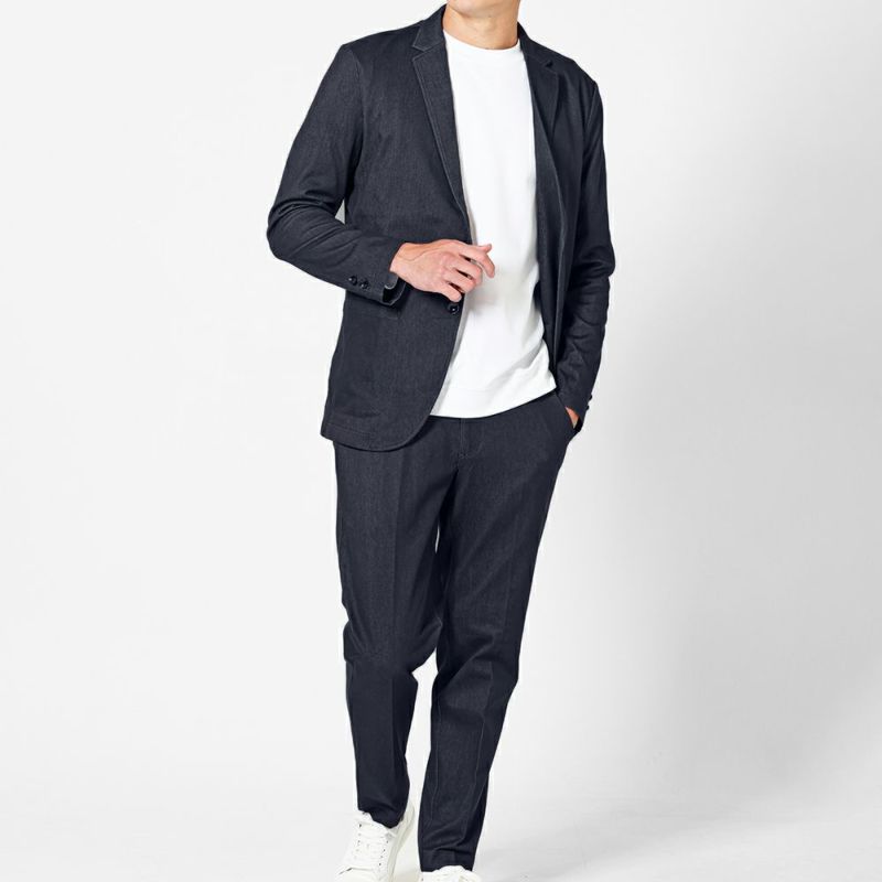 深みのあるデニムライク生地でモダンスマートな印象を与える大人のカジュアルスーツ。