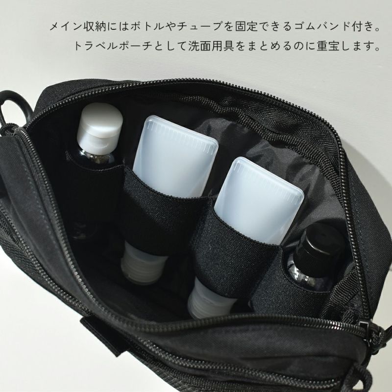 メイン収納にはボトルやチューブを固定できるゴムバンドが付いているので、トラベルポーチとして洗面用具をまとめる時や充電コード類の収納に役立ちます。