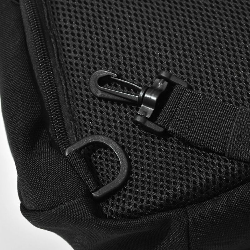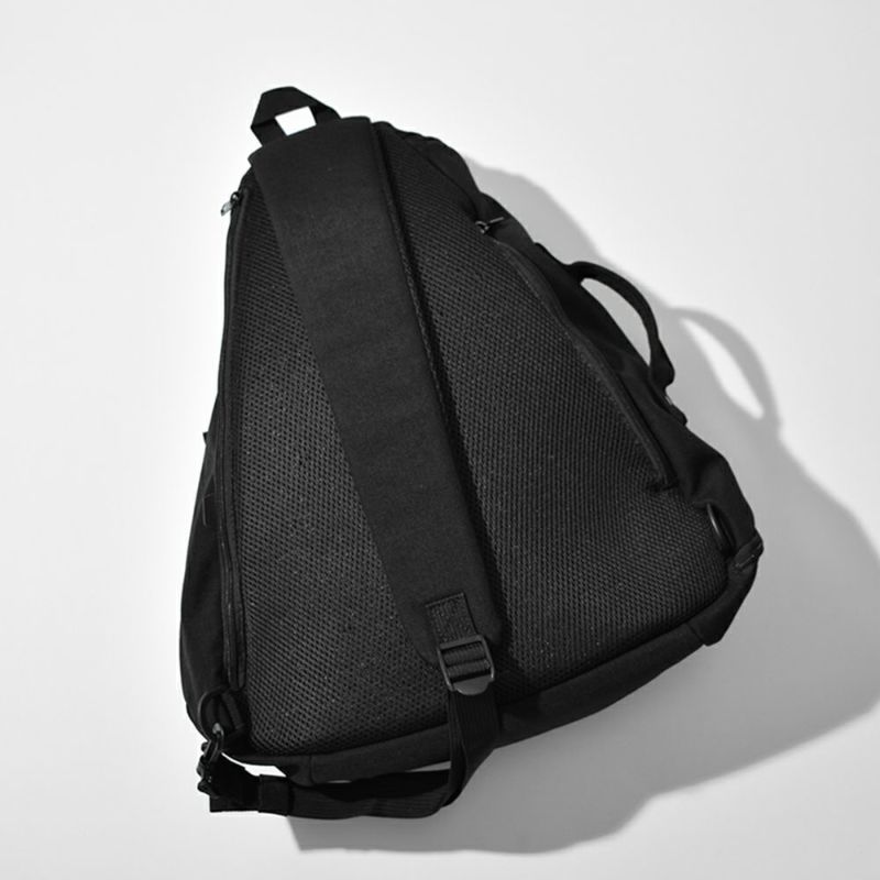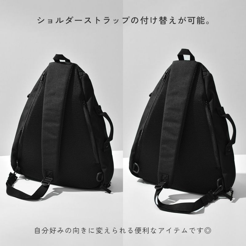 -シンプルながらもスタイリッシュに- タウンユースに特化したクロスボディバッグ。 左右どちらからもメイン収納へアクセスできる仕様になっています。 体のラインに添う三角シェイプで、荷物が多くてもスマートに見えるデザインです。 ショルダーストラップは左右で付け替えが可能なので、自分好みに合わせてご利用いただけます。 表面には撥水加工を施しているので、雨や水滴からも生地を守ってくれます。 メイン収納にはA4サイズのファイルを収納可能◎ 背面側には11インチまでのタブレットを収納できるクッション構造有の収納スペースもあるので、カジュアルなビジネスシーンや通学にも活躍します。 大きすぎず小さすぎない程よいバランスのサイズ感で、デイリー使いしやすいアイテムです。