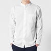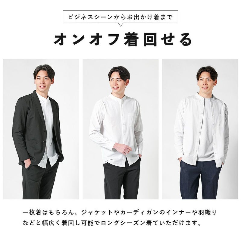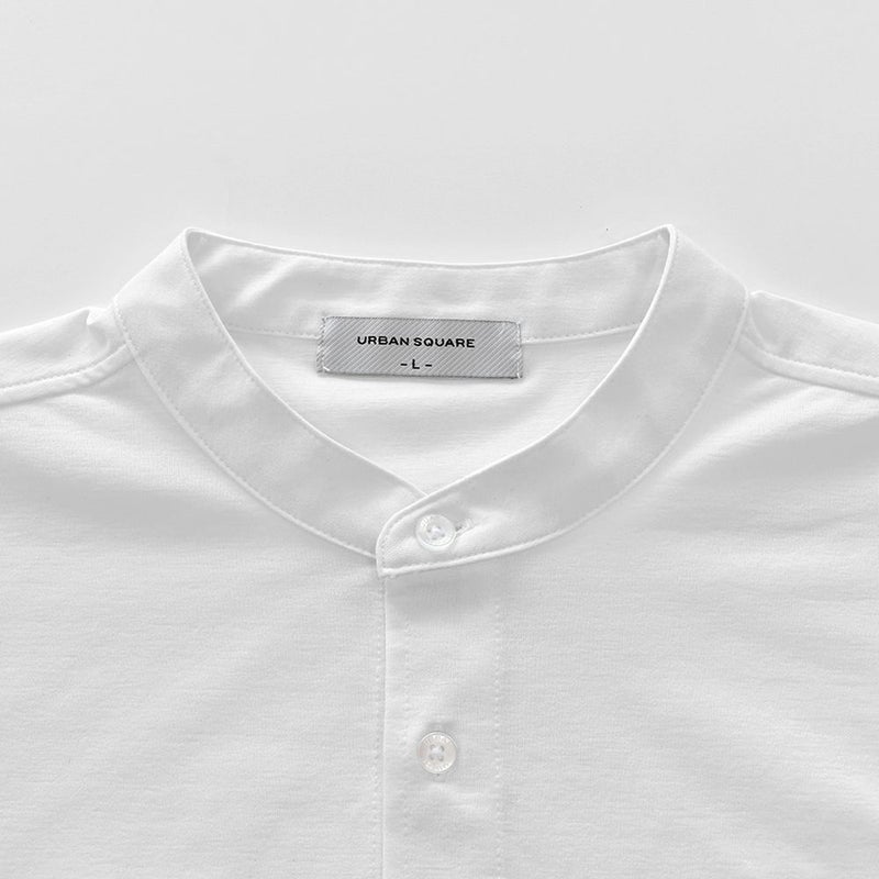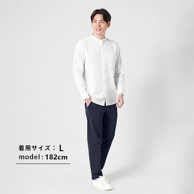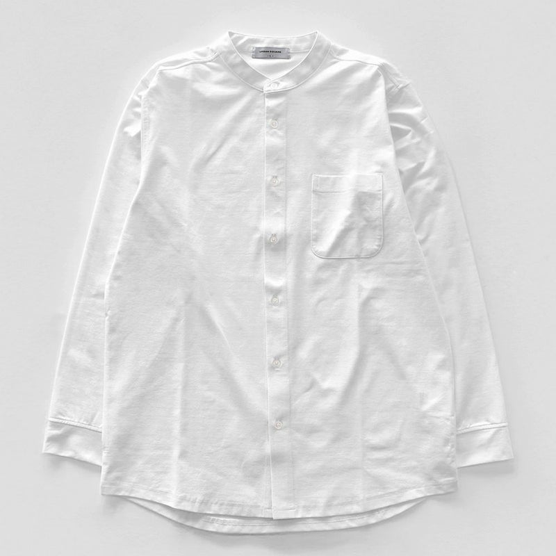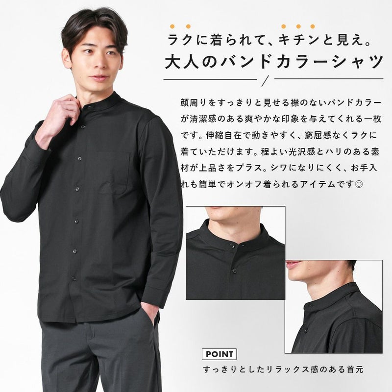 すっきりとした首元に、程よく抜け感のあるバンドカラーシャツ。