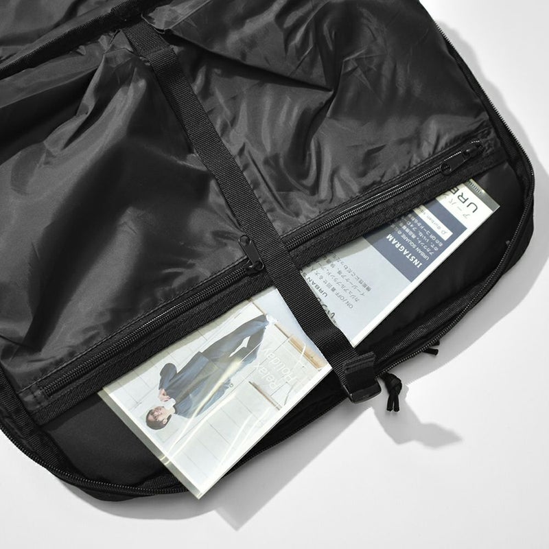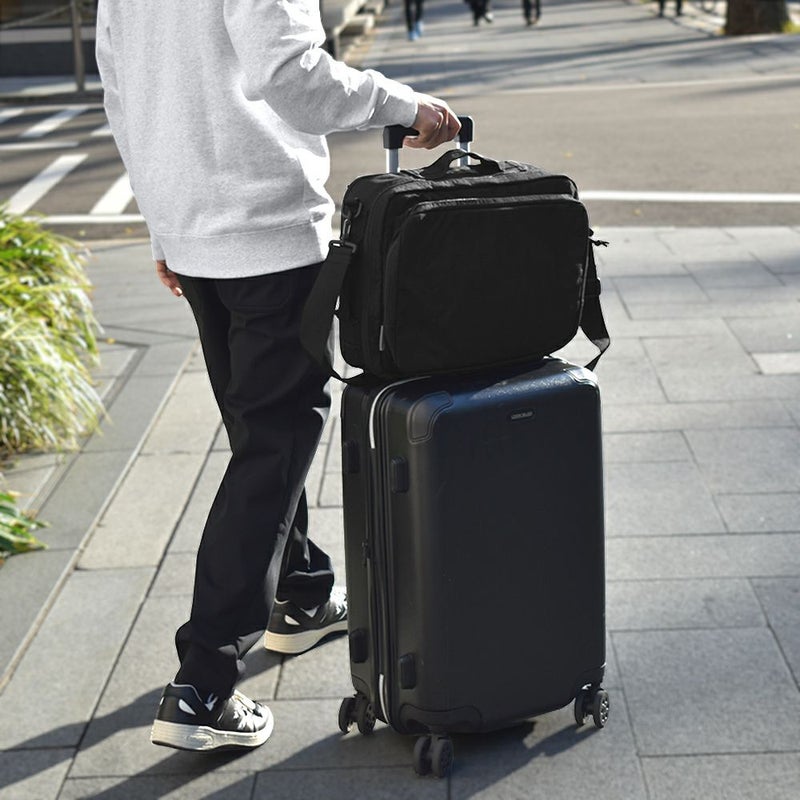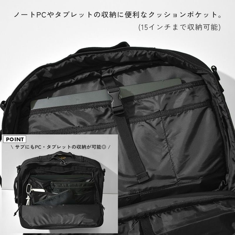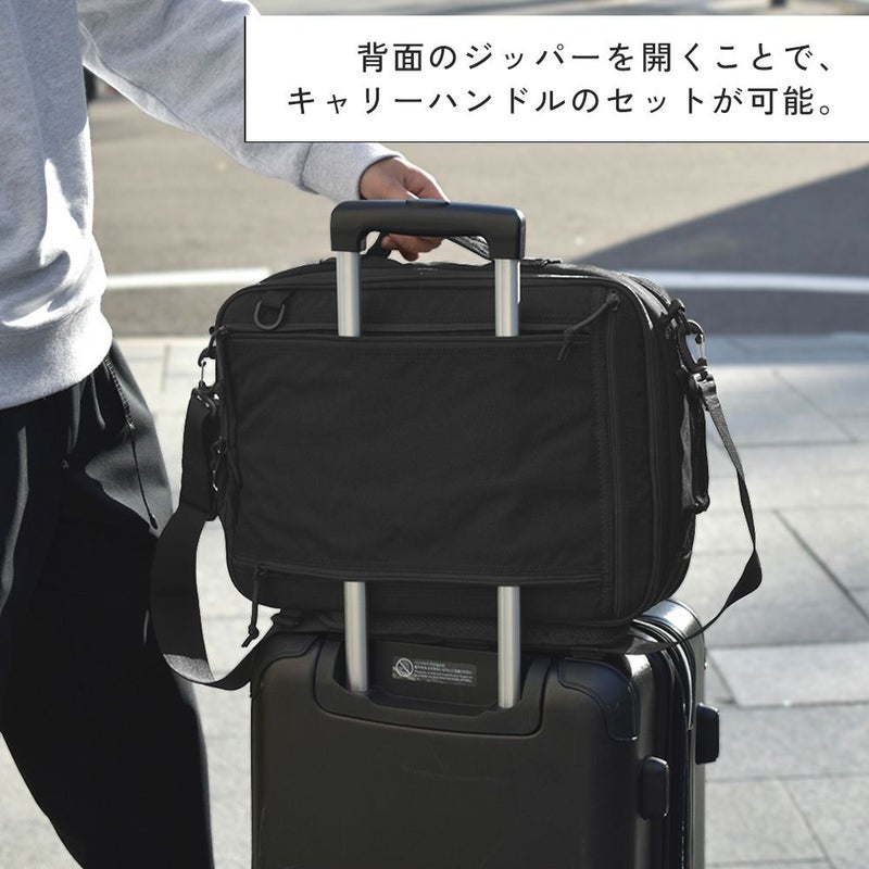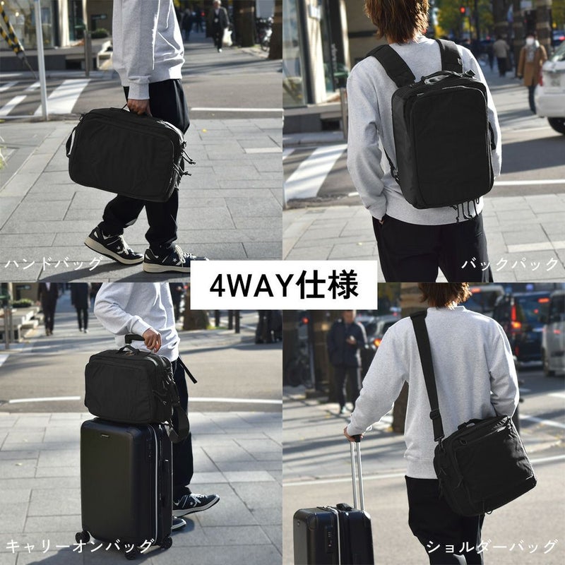 -通勤や出張などビジネスに特化したバックパック- リュックサック/ハンドバッグ/ショルダーバッグ/キャリーオンバッグの4WAYで使える、ビジネスシーンに大変便利なアイテムです。 底面には水汚れに強いターポリンを採用。 容量を増やせる拡張ファスナーを付属しているので、出張時など荷物が増えた際に大変便利です◎ メイン収納は全面開放ができるため、書類やファイル、着替えなどの収納に、サブ収納にはタブレットなど出し入れの頻度が多いアイテムの収納におすすめです。 メインとサブどちらにも15インチまでのPC・タブレットの収納が可能。また、計10個のポケットを付属しているのでガジェット類など小物の整理整頓にも大変便利です。 シンプルなデザインなので、ビジネスシーン以外にも違和感なくお使いいただけます。