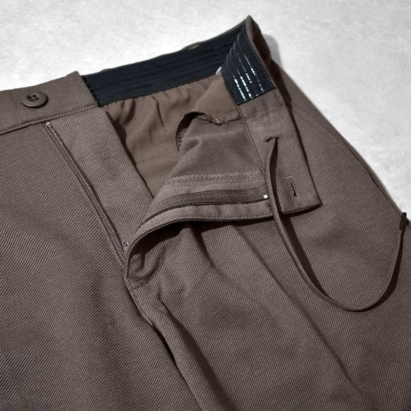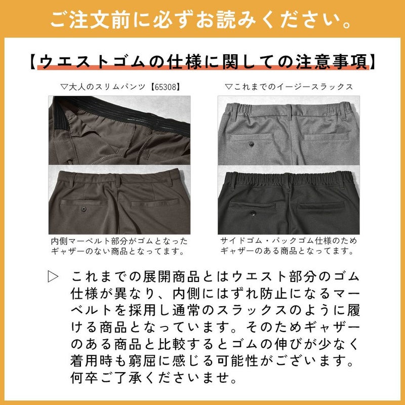 また、ウエスト内側にはずれ防止になるマーベルトを採用し、ギャザーのないウエストゴム仕様になっているため見た目もきれいできちんと感があり、通常のスラックスのように履くことができます。