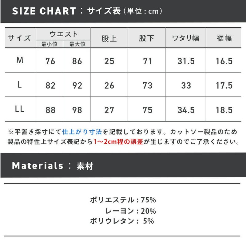 ※こちらの商品のウエスト表記に関しましては、ウエスト部分を端から端まで測った採寸値を2倍にした長さを表記しているため、表記より±1~2cmの誤差ではなく『±1~4cmまでの誤差』が生じることになります。ご了承ください。