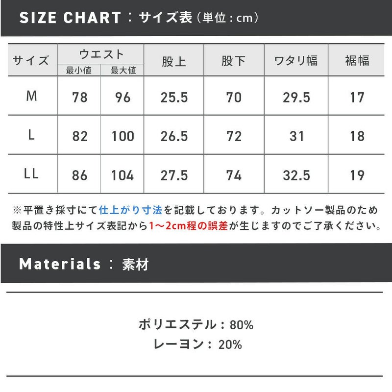 ※こちらの商品のウエスト表記に関しましては、ウエスト部分を端から端まで測った採寸値を2倍にした長さを表記しているため、表記より±1~2cmの誤差ではなく『±1~4cmまでの誤差』が生じることになります。ご了承ください。