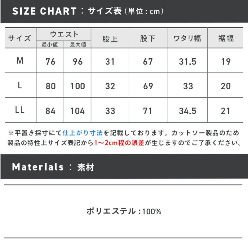 ※商品タグに記載しているサイズ表記はJIS規格であり商品の実寸サイズとは異なります。 ※サイズ表は仕上がり寸法を記載しています。ヌード寸とは異なります。 ※カットソー製品のため製品の特性上、サイズ表記より1~2cm前後する可能性があります。 また、カラーによっても個体差が出る可能性があり、多色買いの際にはカラーによってサイズ感も異なります。 ※ウエスト表記に関しましては、ウエスト部分を端から端まで測った採寸値を2倍にした長さを表記しているため、表記より±1~2cmの誤差ではなく『±1~4cmまでの誤差』が生じることになります。ご了承ください。 ※サイズ表記より±1~2cmの誤差内である場合は不良品交換・返品として承ることが出来かねますので、カットソー製品に関しまして何卒ご理解ご了承くださいますようお願い申し上げます。
