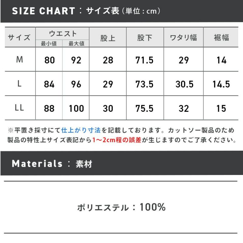 ※こちらの商品のウエスト表記に関しましては、ウエスト部分を端から端まで測った採寸値を2倍にした長さを表記しているため、表記より±1~2cmの誤差ではなく『±1~4cmまでの誤差』が生じることになります。ご了承ください。