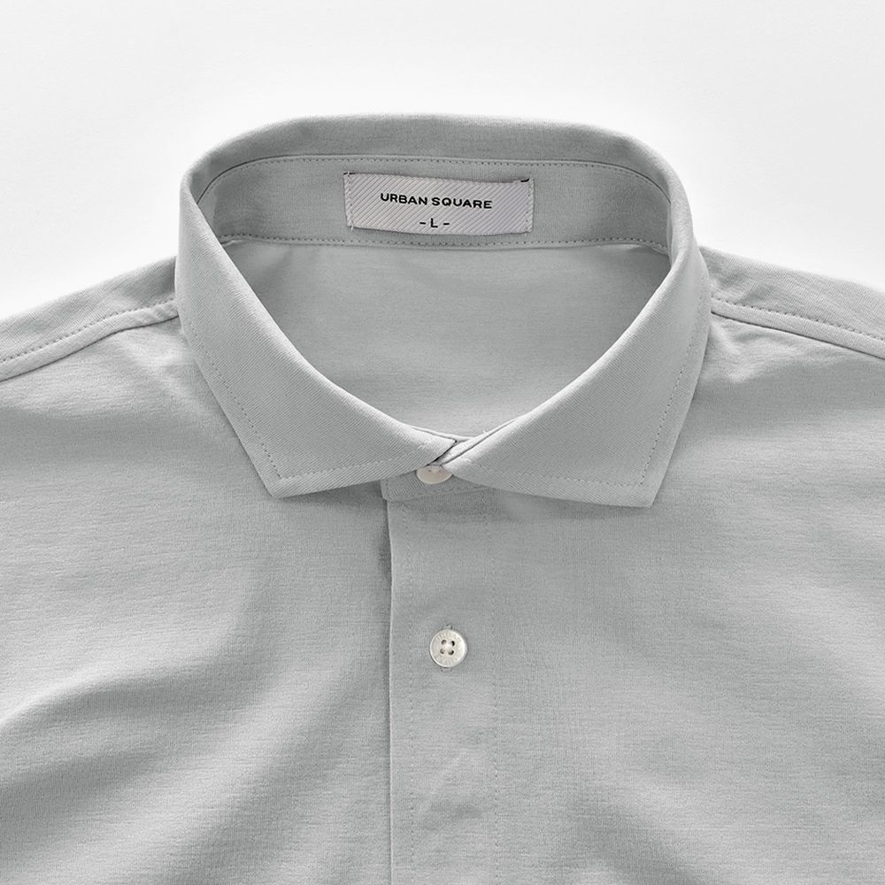 小さめの襟に襟の開きが広い、首回りをすっきりと見せてくれるカッタウェイシャツ。