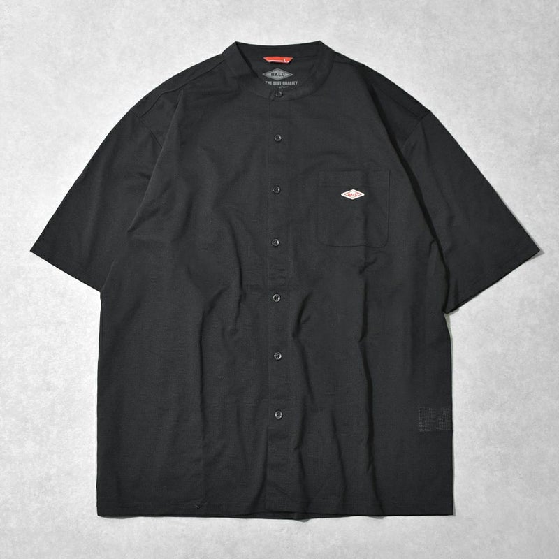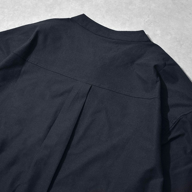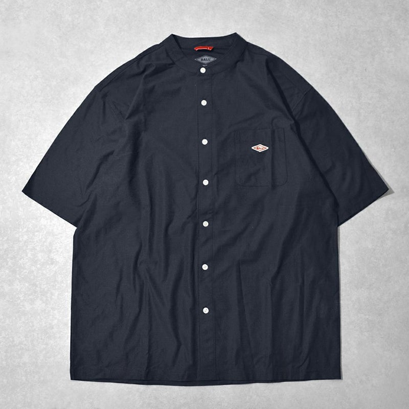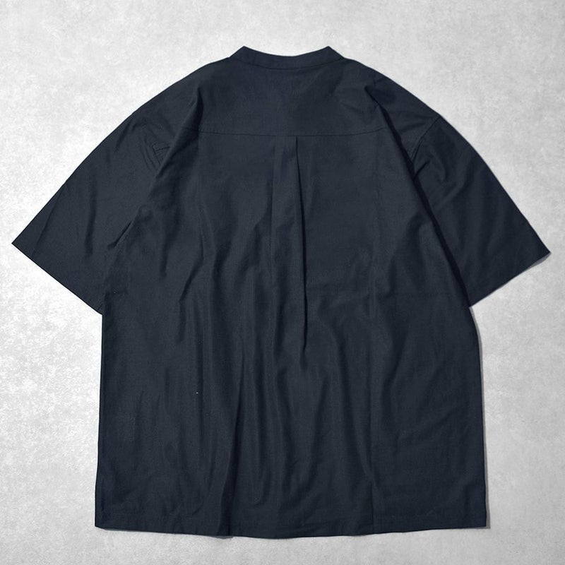 襟のないすっきりとした首元が特徴の涼しげなバンドカラー半袖シャツ。