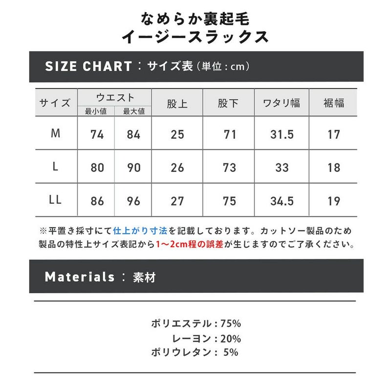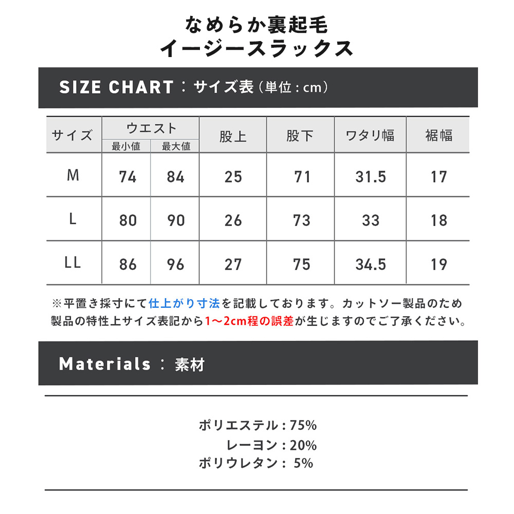 ※こちらの商品のウエスト表記に関しましては、ウエスト部分を端から端まで測った採寸値を2倍にした長さを表記しているため、表記より±1~2cmの誤差ではなく『±1~4cmまでの誤差』が生じることになります。ご了承ください。