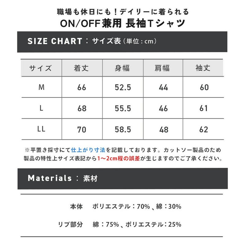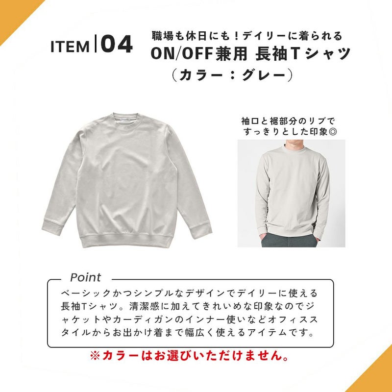 清潔感のあるベーシックかつシンプルなデザインのデイリーに使えるON/OFF兼用長袖Tシャツ。