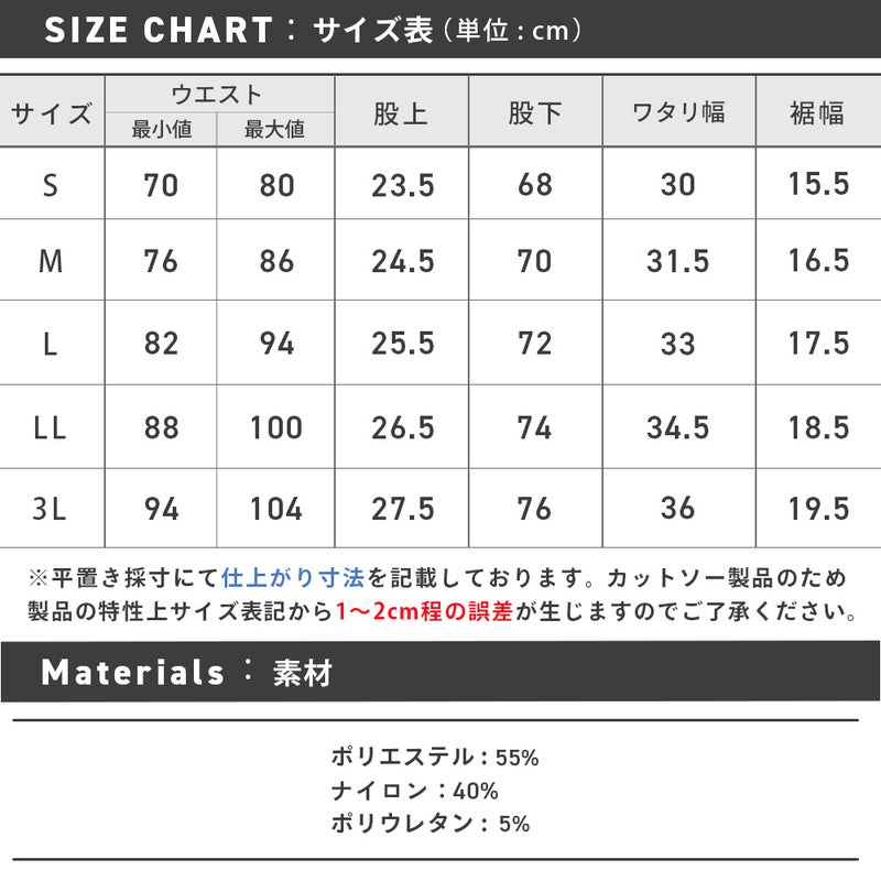 ※こちらの商品のウエスト表記に関しましては、ウエスト部分を端から端まで測った採寸値を2倍にした長さを表記しているため、表記より±1~2cmの誤差ではなく『±1~4cmまでの誤差』が生じることになります。ご了承ください。
