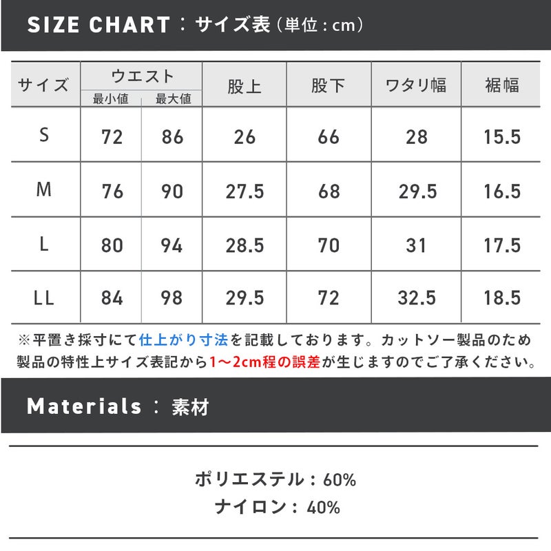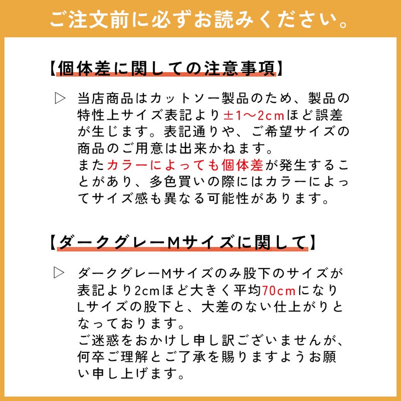 ※ダークグレーMサイズのみ、股下の長さがサイズ表記より2cm程長い傾向があります。詳しくは【個体差、サイズに関しての注意事項】に記載しておりますので必ずご確認ください。