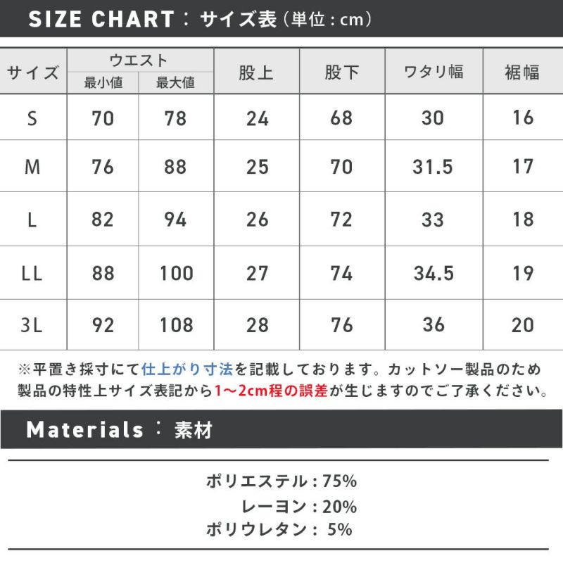 ※こちらの商品のウエスト表記に関しましては、ウエスト部分を端から端まで測った採寸値を2倍にした長さを表記しているため、表記より±1~2cmの誤差ではなく『±1~4cmまでの誤差』が生じることになります。ご了承ください。