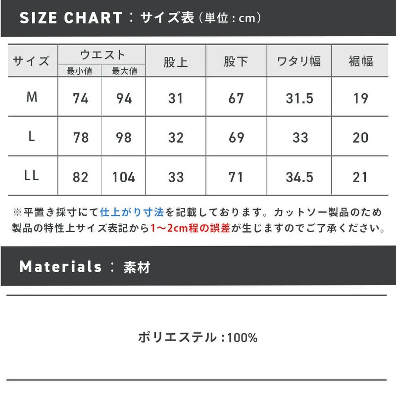 ※商品タグに記載しているサイズ表記はJIS規格であり商品の実寸サイズとは異なります。 ※サイズ表は仕上がり寸法を記載しています。ヌード寸とは異なります。 ※カットソー製品のため製品の特性上、サイズ表記より1~2cm前後する可能性があります。 また、カラーによっても個体差が出る可能性があり、多色買いの際にはカラーによってサイズ感も異なります。 ※ウエスト表記に関しましては、ウエスト部分を端から端まで測った採寸値を2倍にした長さを表記しているため、表記より±1~2cmの誤差ではなく『±1~4cmまでの誤差』が生じることになります。ご了承ください。 ※サイズ表記より±1~2cmの誤差内である場合は不良品交換・返品として承ることが出来かねますので、カットソー製品に関しまして何卒ご理解ご了承くださいますようお願い申し上げます。