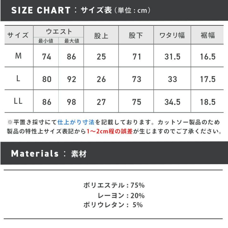 ※こちらの商品のウエスト表記に関しましては、ウエスト部分を端から端まで測った採寸値を2倍にした長さを表記しているため、表記より±1~2cmの誤差ではなく『±1~4cmまでの誤差』が生じることになります。ご了承ください。