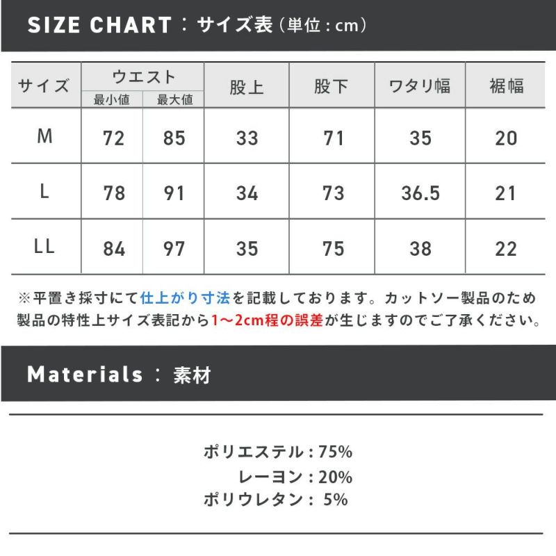 ※こちらの商品のウエスト表記に関しましては、ウエスト部分を端から端まで測った採寸値を2倍にした長さを表記しているため、表記より±1~2cmの誤差ではなく『±1~4cmまでの誤差』が生じることになります。ご了承ください。