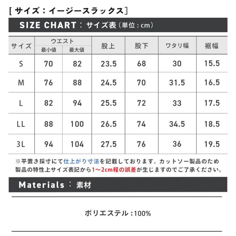 ※スラックスのウエスト表記に関しましては、ウエスト部分を端から端まで測った採寸値を2倍にした長さを表記しているため、表記より±1~2cmの誤差ではなく『±1~4cmまでの誤差』が生じることになります。ご了承ください。
