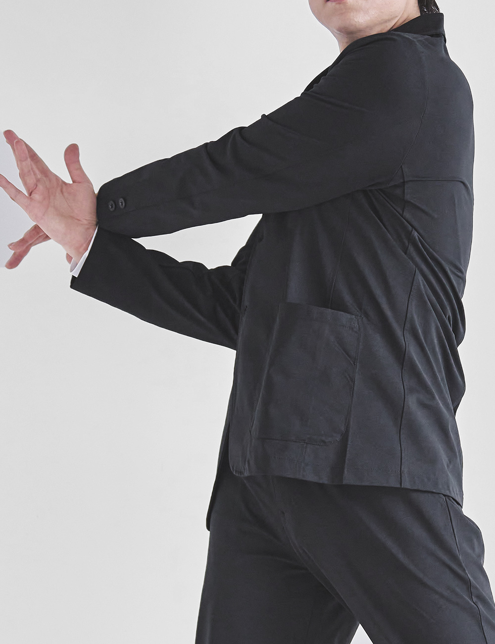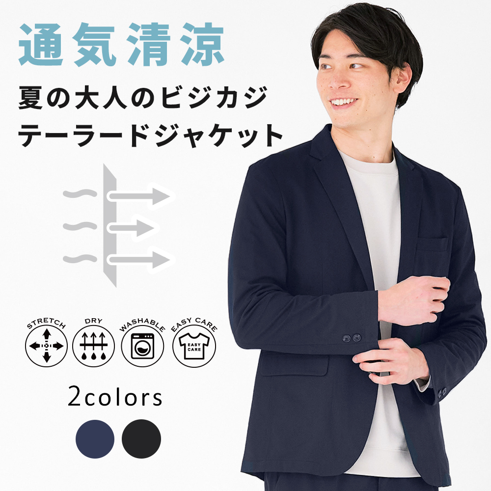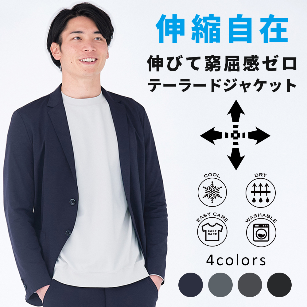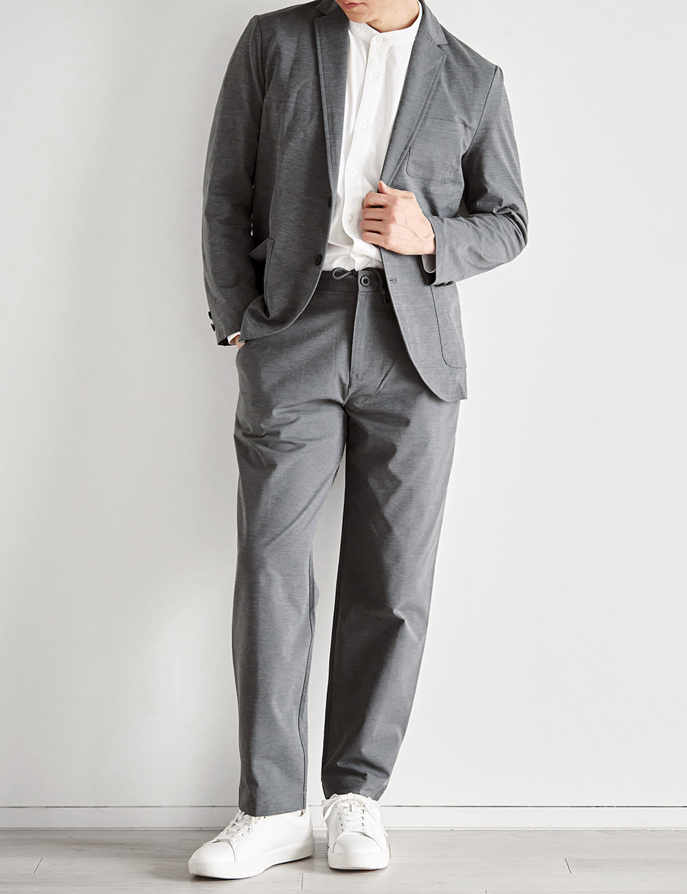 高いストレッチ性で動きやすく、夏場でも涼しく快適に着られるひんやりな 着心地のカジュアルスーツ。しっかりしたハリ感がありきちんと感を演出して くれる生地は、全方向によく伸びる楽ちんストレッチジャージー素材。 さらに家庭洗濯でお手入れも簡単!