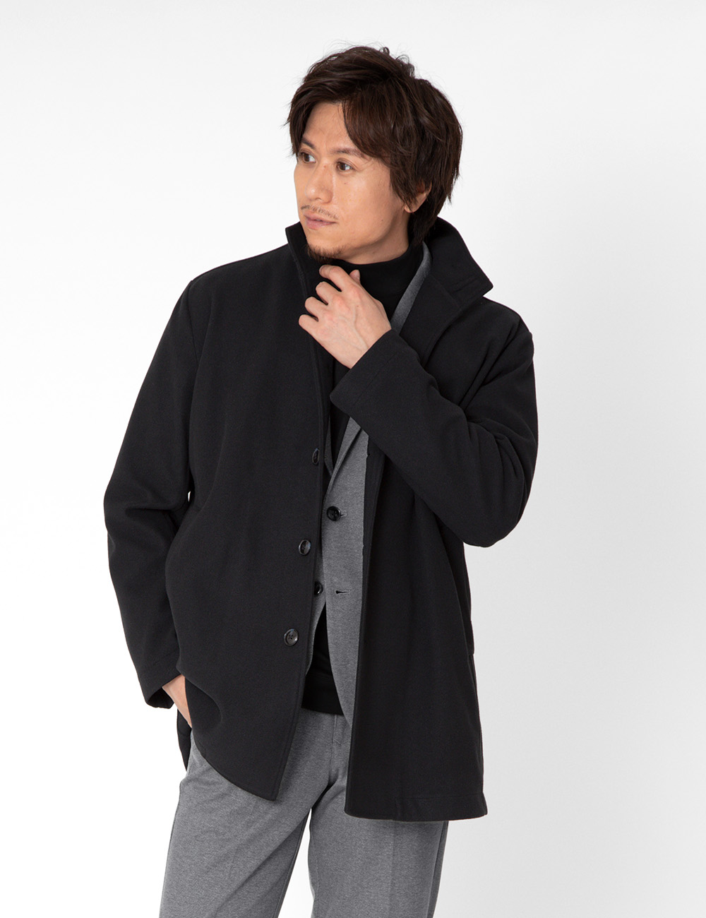 手触りや風合いがウールのように滑らかな、 メルトン素材のアウター。襟を立てても 折り返しても着用できる便利なイタリアンカラー。 ストレッチ性もあるため、冬の重ね着にも ストレスフリーに羽織っていただけます◎